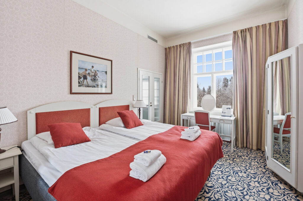 Upeat koskinäkymät ylellisessä ja tilavassa sviitissä. Sviitissä on erillinen makuu- ja olohuone. Sviitti sijaitsee linnarakennuksessa.